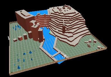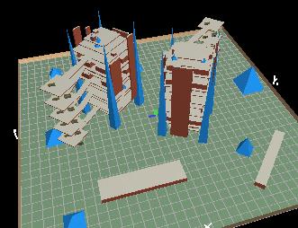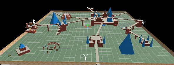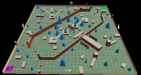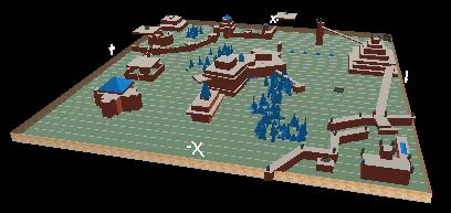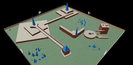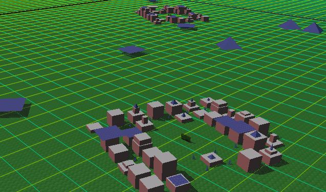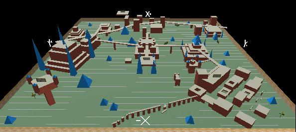 The more general theme in the map is having distinct "neighborhoods", areas which visually feel different and which call for different tactics in fighting. There is quite a lot of open space, requiring old-fashioned tank vs. tank maneuvering. The number of neighborhoods means that this map will be good for more players, 8 being fine; more could certainly play. There are only 337 blocks and pyramids, so lag shouldn't be a problem.