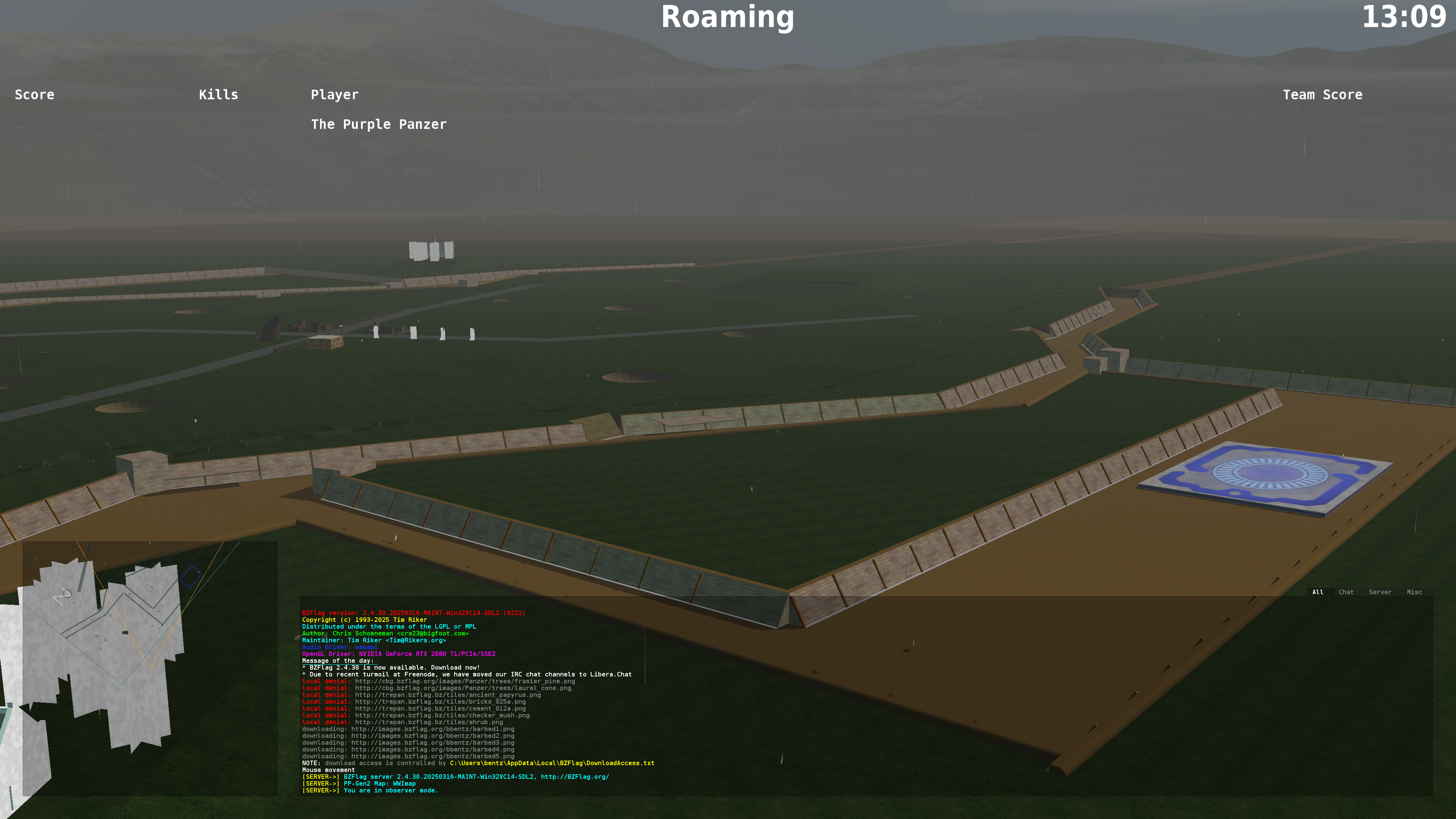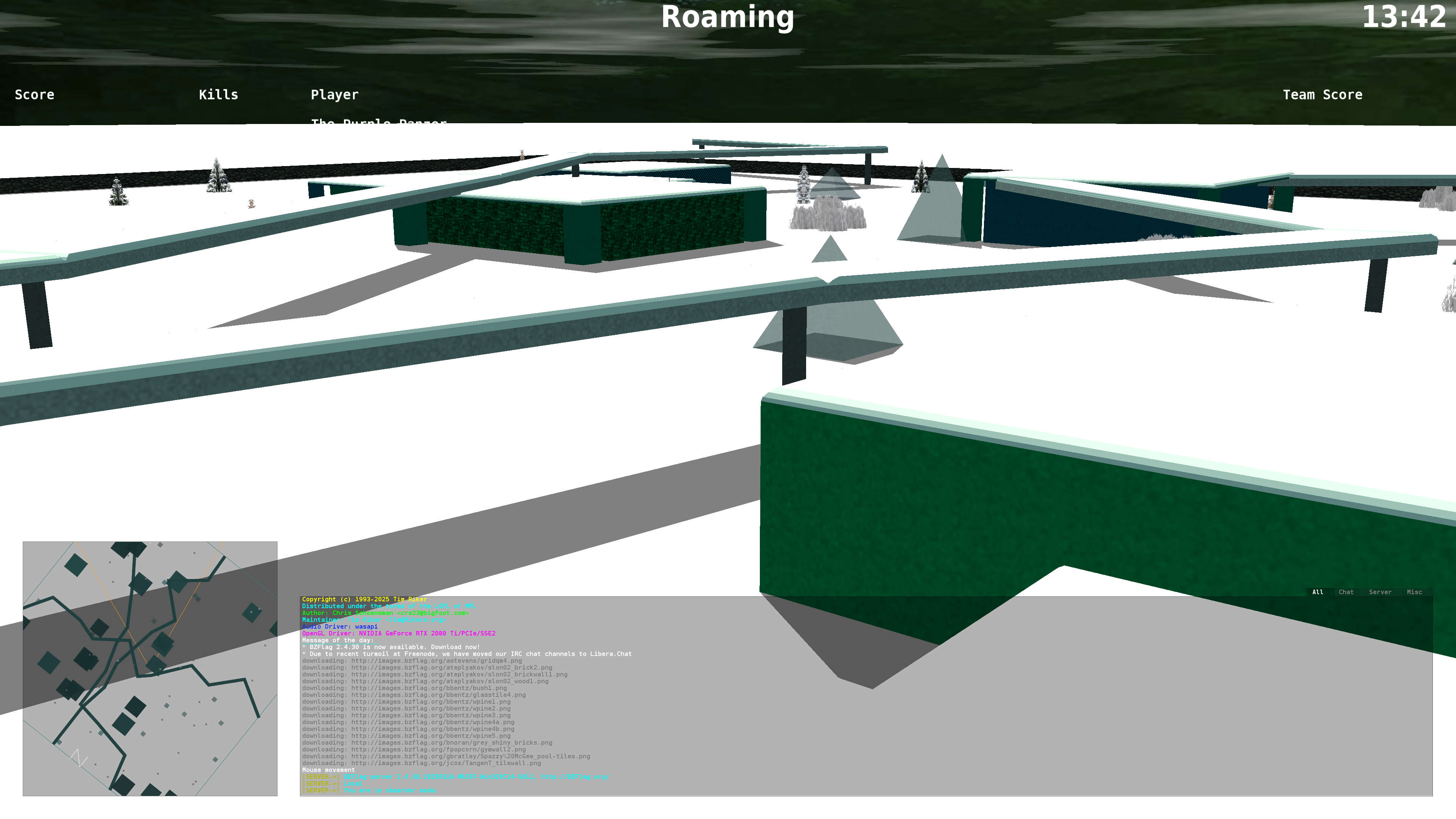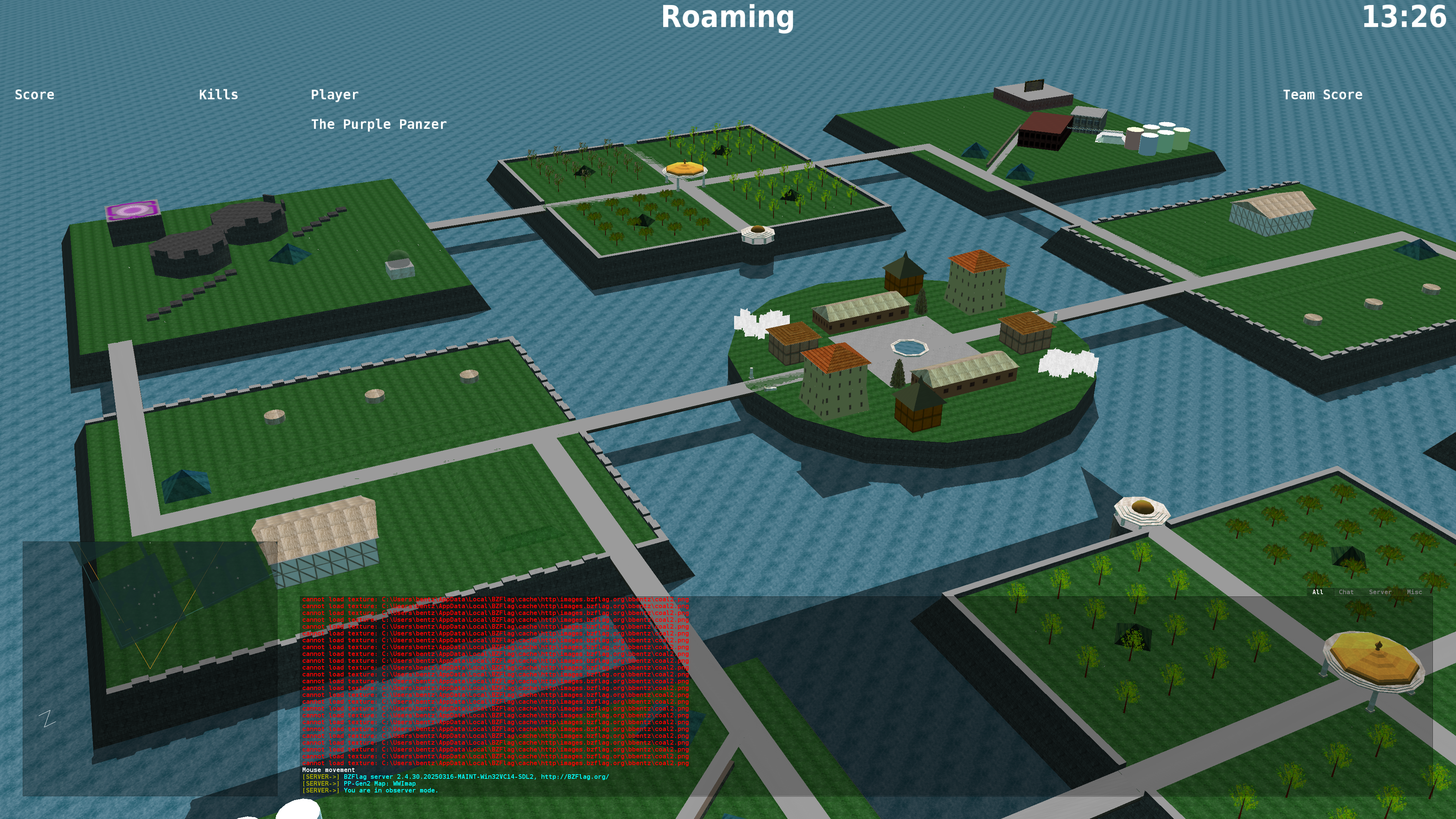 As I use the name "The Purple Panzer", I wanted one of the teams to be purple; the other is blue, simply because I don't see it all that much on servers. (As the documentation seemed to be contradictory, the bzfs qualifier I use is "-mp 0,0,0,4,4,4", setting 4 blue, 4 purple, and 4 observers, 4 just for my testing purposes - higher is better.)