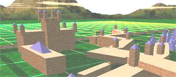 Inside the cube are a number (25, I think) of levels (or floors); each only partially covers that slice through the cube, so it is relatively easy to jump up to the next level or fall through to a lower level. Vertical walls and pyramids interrupt each floor, so that you may well have to move in three dimensions to get from one place to another. When driving, it is almost as easy to go up and down as it is to move on the horizontal. Teleporters inside the cube let you move around from point to point fairly quickly.