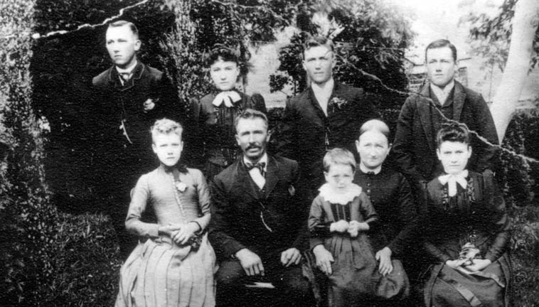 Top Row: William J. Bentz, Mary Bentz Strayer, Monroe H. Bentz, John Bentz. Front Row: Nancy Bentz Cook, Solomon Bentz, Henrietta Hershey Bentz (holding Emma Bentz Wonders), and Elizabeth Bentz Sheffer.