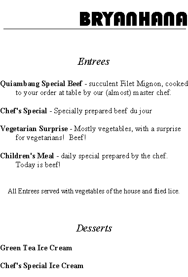 When we were ready for dinner, I called the family to the table, where the empty plates were arranged around three sides. We all sat down - there was no silverware, and no food. Within a few seconds my wife (who was not in on this) gave me a rather bizarre look. I excused myself, and went in to the kitchen, put on a robe I'd acquired in Japan, took the electric griddle into the dining room, and handed the menus I'd made up: