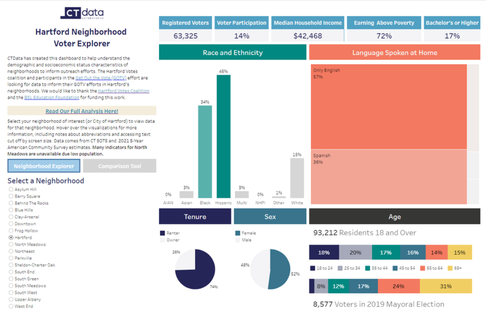 The basic data is publicly available from the registrar of voters, and includes CT voter ID, name, address, voting history, party affiliation, and so forth. I also bring in public data from the Assessor's office about properties owned, and other public information about political donations people have made.