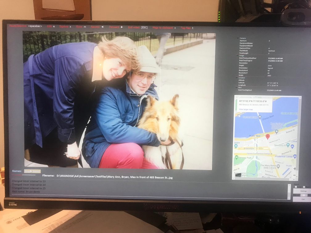 If you look closely, below the photo, highlighted in a kind of tan and not very readable, is my name, just to the right of the text that says "Names:". When I moved the mouse over it, a rectangle appeared over my face (between my wife and my dog). Often there are many people in any given photo, and they each get a rectangle spaced out horizontally. By moving the mouse one may see the faces in the video (right now at least it doesn't work the other way, you can't move the mouse over a face and see the name, but that's fairly trivial to do). To the right of the photo is a map - if I have the lat/lon in the EXIF data I toss up a google map of the area, in this case outside our old condo at 483 Beacon St. in Boston. Above the map is the detailed EXIF data (at least some of it), identifying the camera type, the focal length, etc.