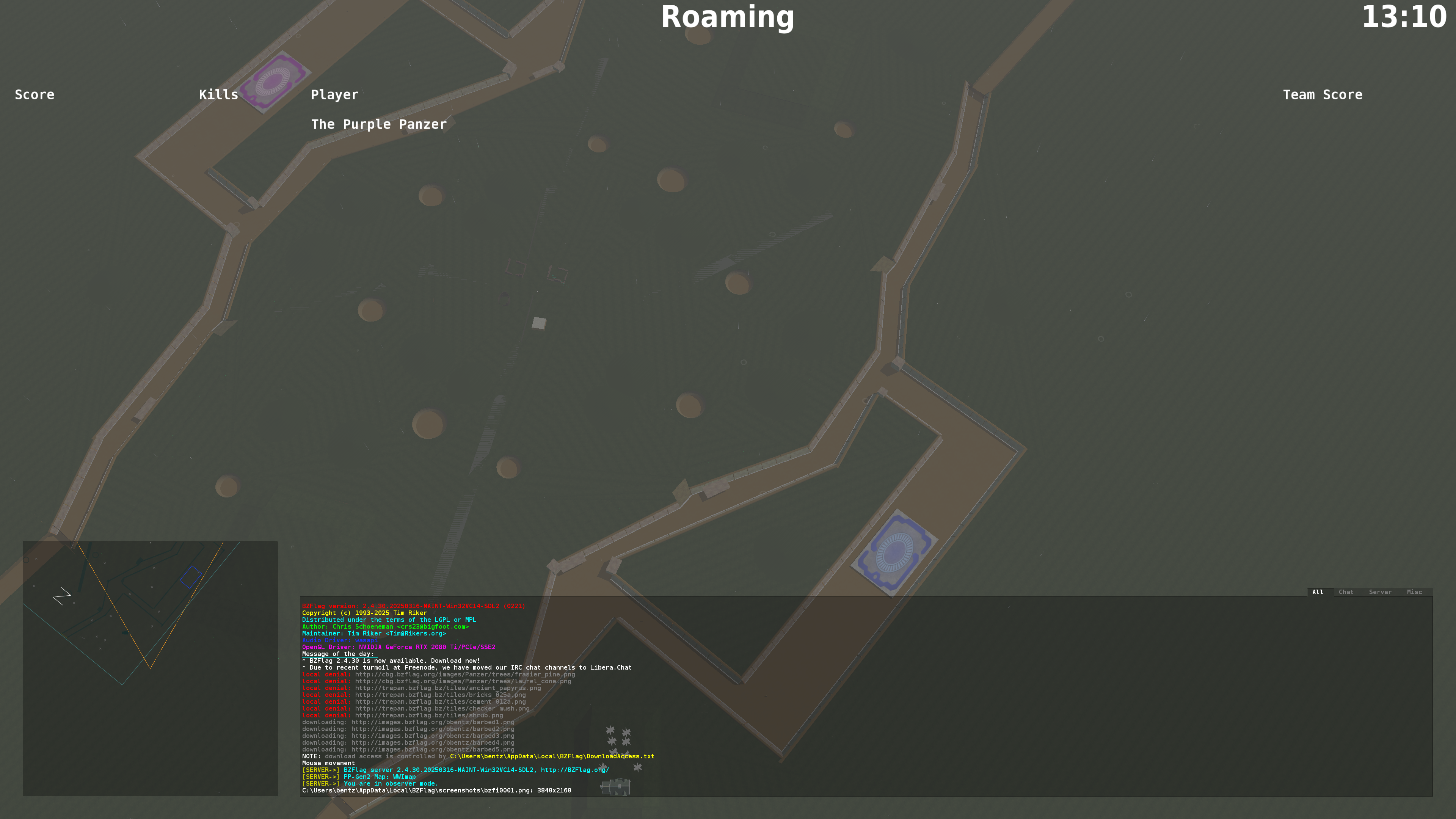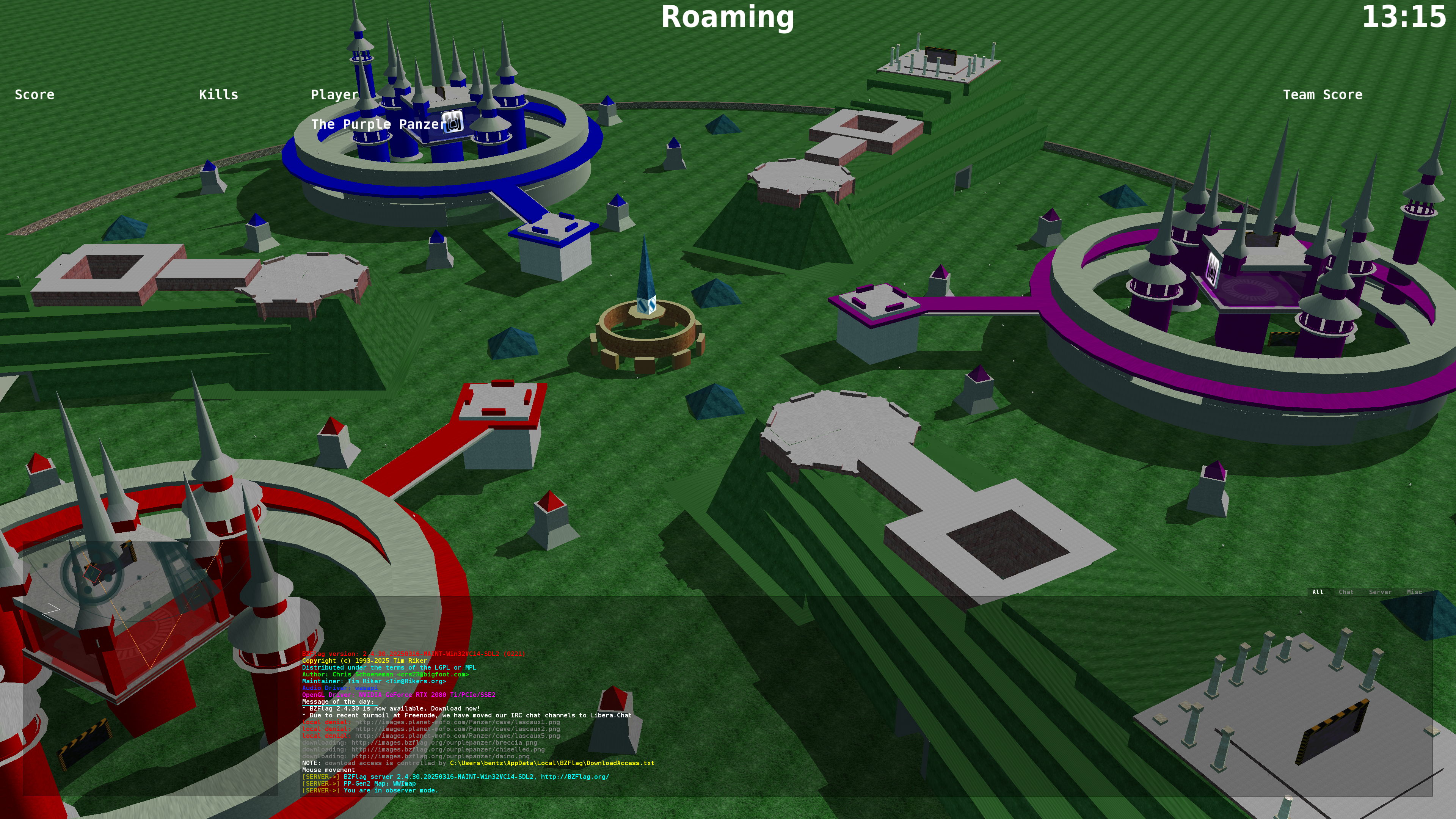 As I use the name "The Purple Panzer", I wanted one of the teams to be purple; the other is blue, simply because I don't see it all that much on servers. (As the documentation seemed to be contradictory, the bzfs qualifier I use is "-mp 0,0,0,4,4,4", setting 4 blue, 4 purple, and 4 observers, 4 just for my testing purposes - higher is better.)