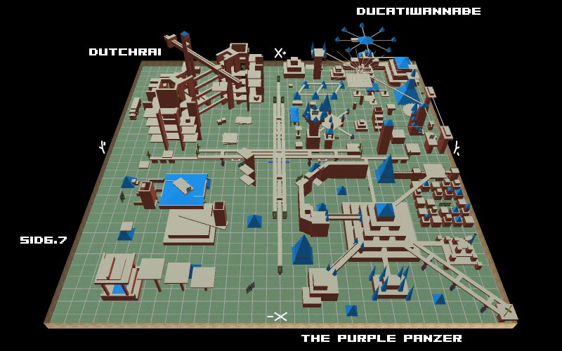 The more general theme in the map is having distinct "neighborhoods", areas which visually feel different and which call for different tactics in fighting. There is quite a lot of open space, requiring old-fashioned tank vs. tank maneuvering. The number of neighborhoods means that this map will be good for more players, 8 being fine; more could certainly play. There are only 337 blocks and pyramids, so lag shouldn't be a problem.