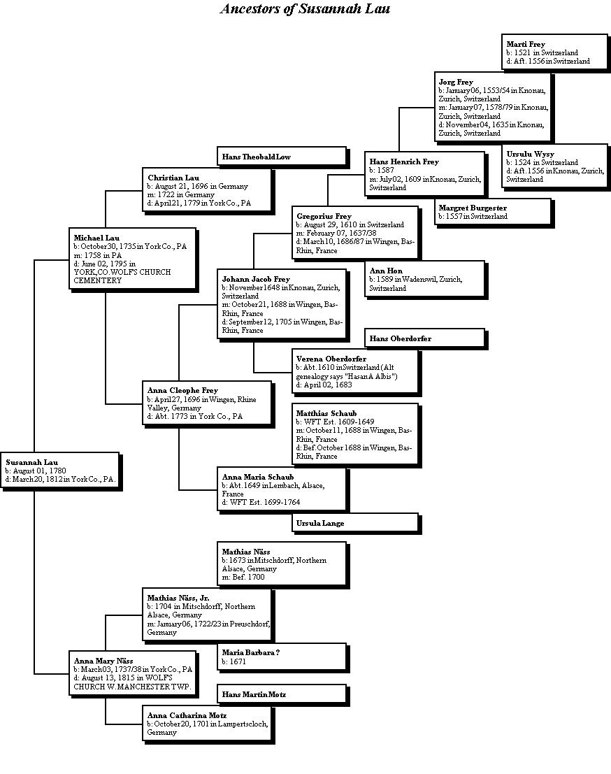 | Husband: Johan Jacob Bentz Born: November 23, 1781 (York Co.) Died: March 22, 1835 (York Co.) Michael Lau's "Bentz Families of York County, PA and Surrounding Areas" lists him also as Jacob Pentz. He further quotes Baptisms at Zeigler's Church in North Codorus Twp and an obituary of Jacob in the York Gazette, March 31, 1835. First Wife: Susannah Lau The kids are not right here:There is some overlap, probably because different sources have given me the same children as offspring of different marriages. Also, the Mary Bushy information I have has little supporting data. CHILDREN (First Marriage): Mary Magdalene Bentz Second Wife: Mary Bushy Children (Second Marriage): Eve Bentz Anna Maria Bentz Born: September 9, 1784 Married: 1827 Spouse: Philip Snider Died: 1867 Children: George Washington Snider |