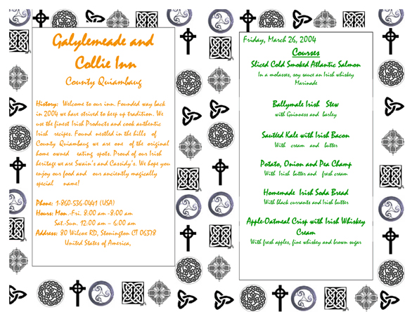 My older daughter Genevieve and I decided to cook a number of Irish recipes for fun one night; she really got into this, and made up this menu (printed in landscape mode, it folds in the center. It's a little hard to read but I'm not sure I can find the original):