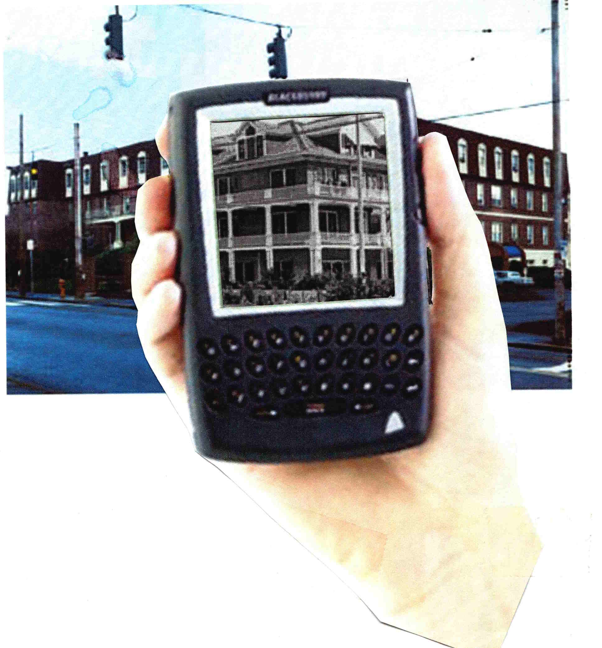You aim your iPhone (or whatever) that way, move it up and down a little, and left and right. The app has extracted key "primal sketch" info from the historic photo - building edges, road intersections, basically the minimum needed to do a match. As you're already aiming at roughly the right space, after not a lot of back and forth the app would provide little arrows to fine-tune your aim, and, when it's right, the historic image would appear, overlapping the current real view you have. You might see individuals or carriages coming down the road, people entering or exiting buildings - it would psychologically be a kind of time-machine, letting you look back to a previous era.